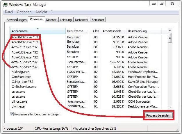 Öffnet den Taskmanager (Rechtsklick auf Taskleiste -> Taskmanager) und sucht dort unter “Details” oder “Prozesse” nach dem Prozess “AcroRd32.exe”